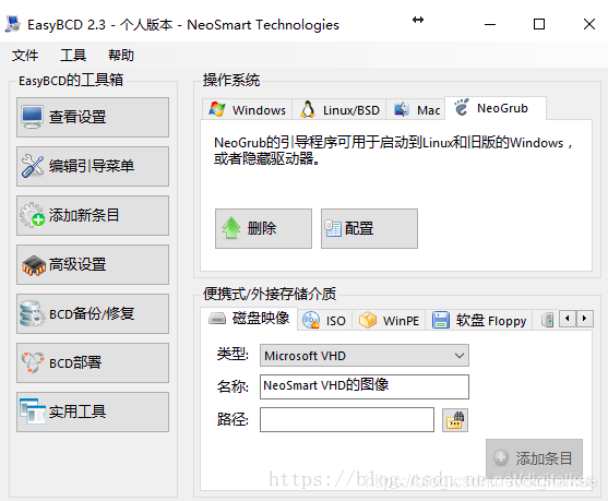 在EasyBCD中点击“配置”可以对文件”NeoGrub”进行编辑。