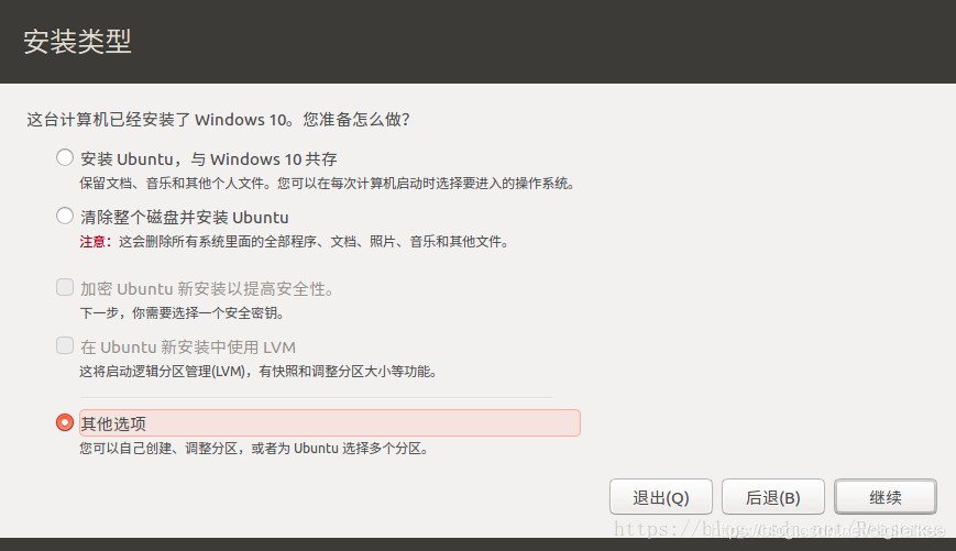 下一步,选择”安装类型”,选择”其他选项”,由我们自己来决定硬盘分区。