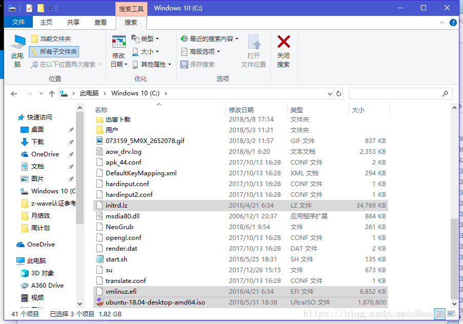 同时将Ubuntu镜像文件拷贝至C盘根目录下,其实就是从C盘引导安装,于是C盘中文件如下: