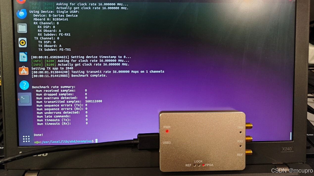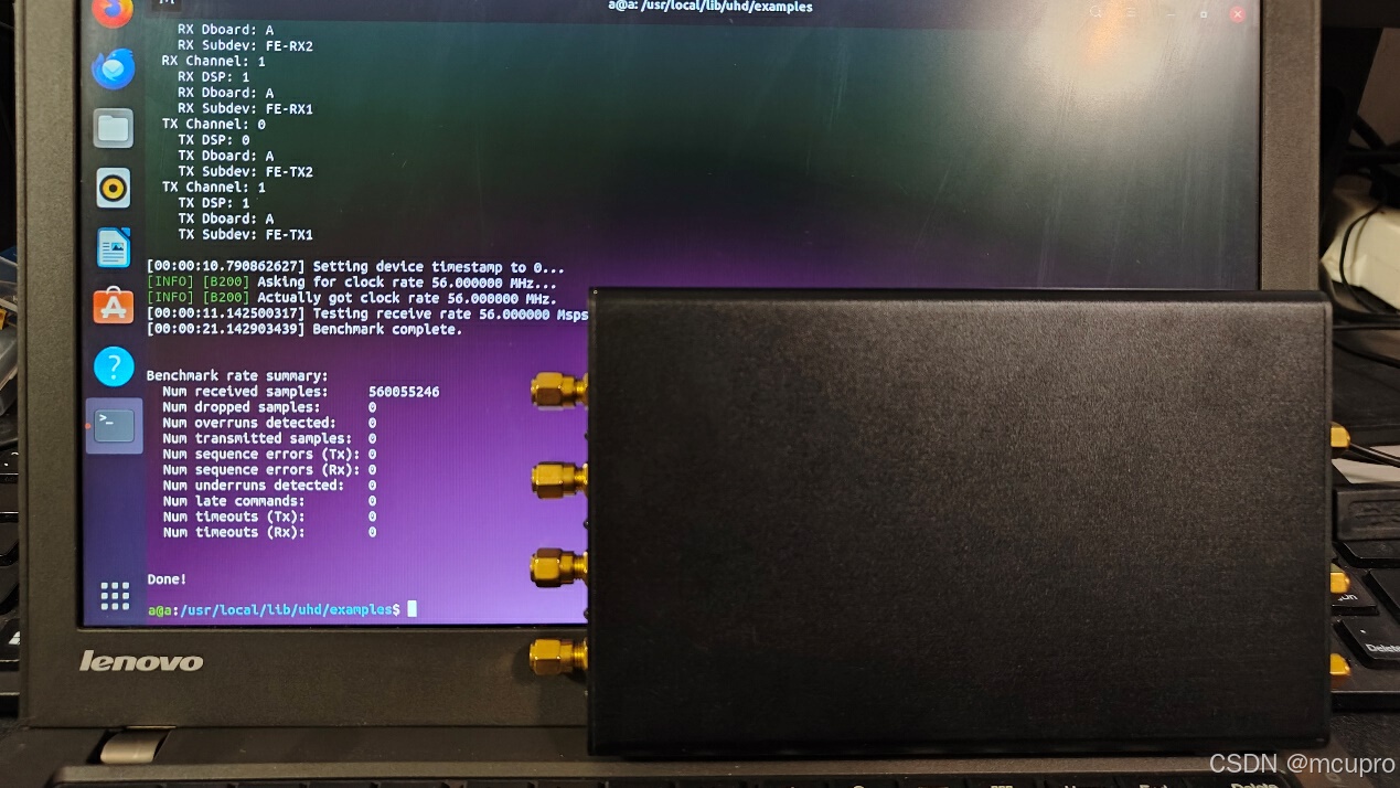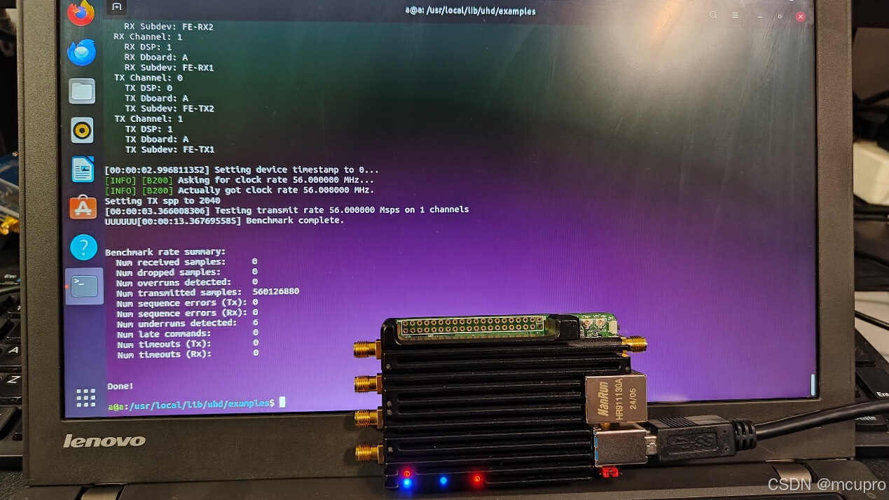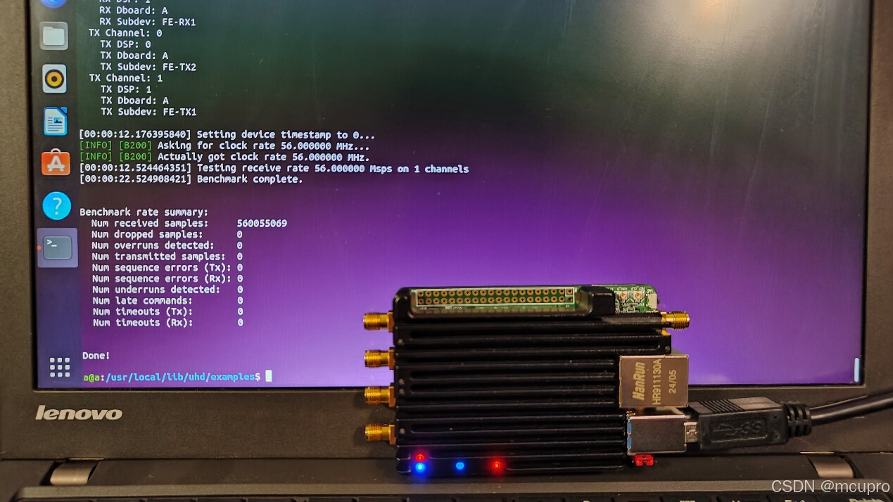 测试环境使用Ubuntu20.04系统,安装UHD4.0,gnuradio等软件。进入目录:/usr/local/lib/uhd/examples,使用命令sudo ./benchmark_rate --tx_rate 56000000 进行发射传输测试,将tx_rate修改为rx_rate进行接受测试。参数56000000本次测试最高速度56M。而B210的设计最高传输速度也只能达到56M。