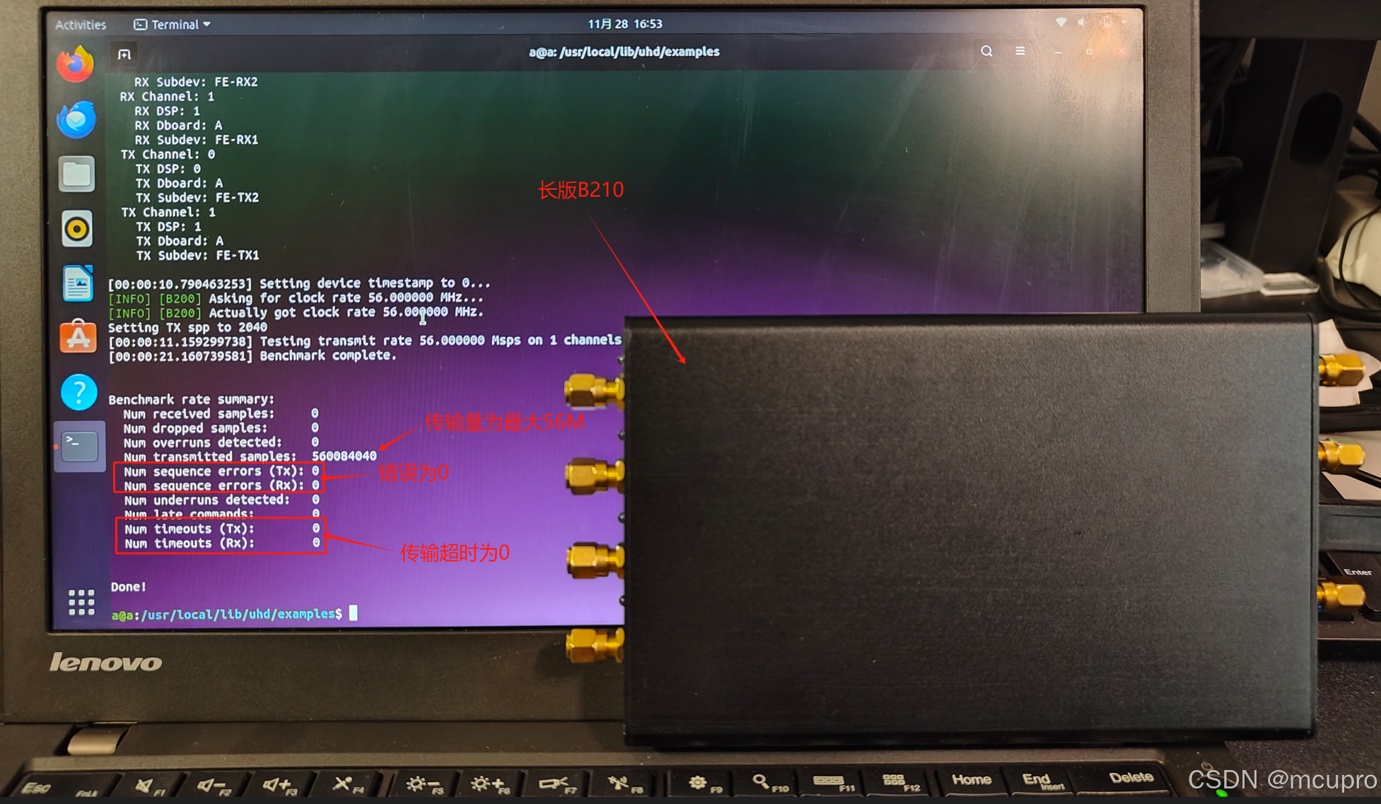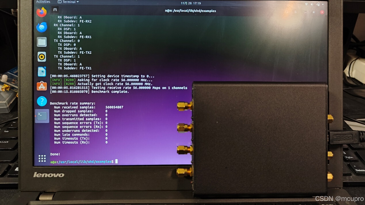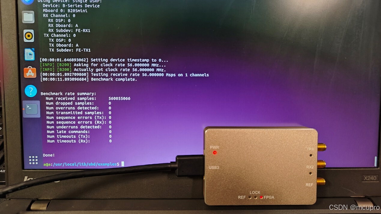 测试环境使用Ubuntu20.04系统,安装UHD4.0,gnuradio等软件。进入目录:/usr/local/lib/uhd/examples,使用命令sudo ./benchmark_rate --tx_rate 56000000 进行发射传输测试,将tx_rate修改为rx_rate进行接受测试。参数56000000本次测试最高速度56M。而B210的设计最高传输速度也只能达到56M。
