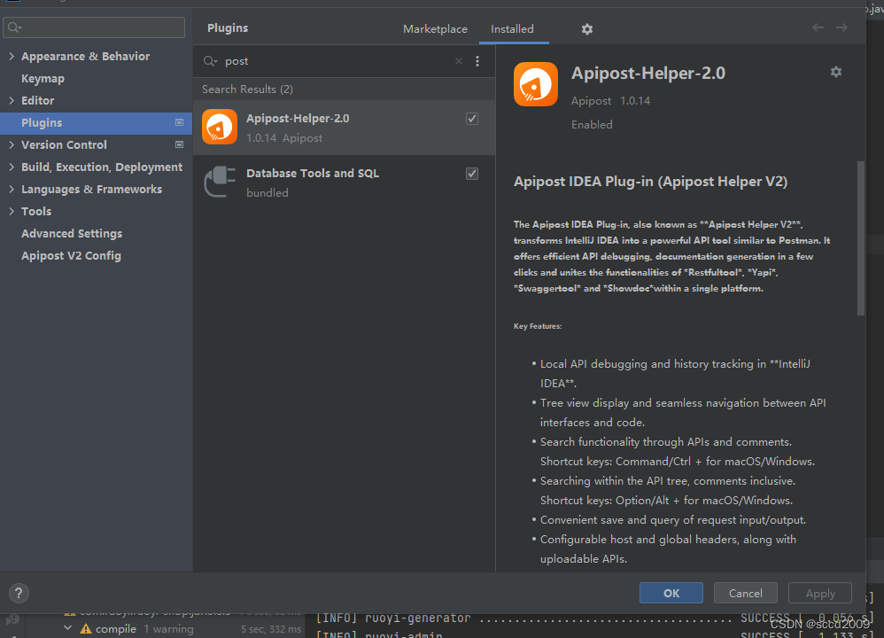 1. idea搜索插件。File---setting---plugins, 搜索apipost,点击安装。