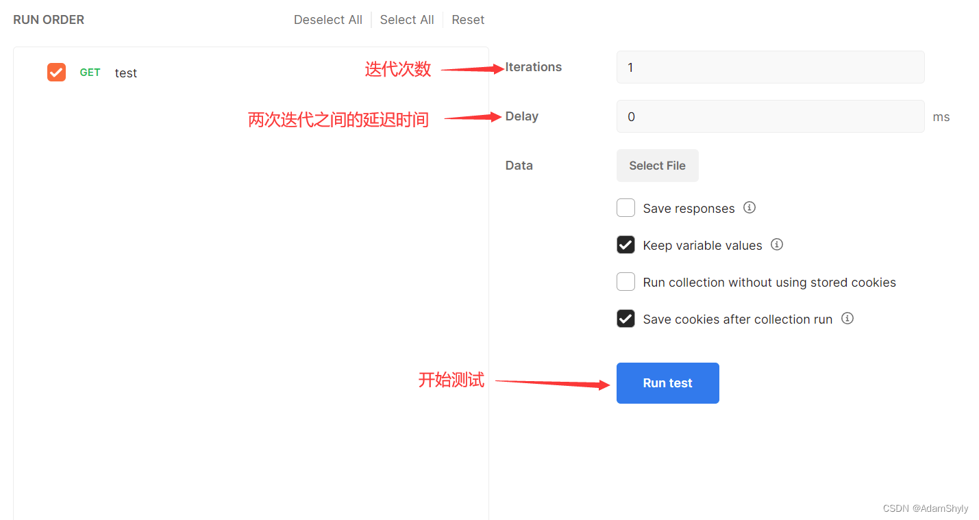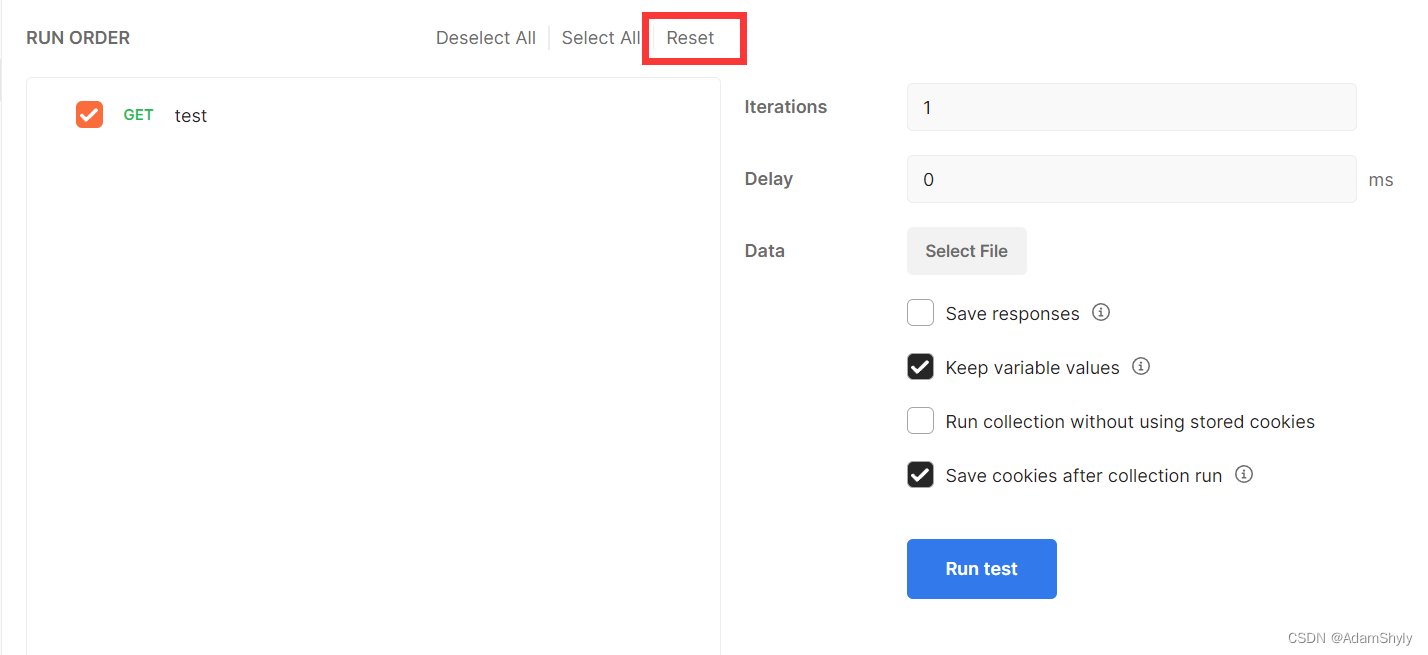 第一步:点击Collections中的 '+' 按钮新增一个Collection第二步:新增一个 request第三步(可选):可以分别对 collection 和 request 进行重命名第四步:修改 request 中的 RequestBody 以及 URL,修改完毕后一定要点击save按钮进行保存第五步:点击 Run collection 按钮第六步:点击 reset 按钮对之前修改过的
