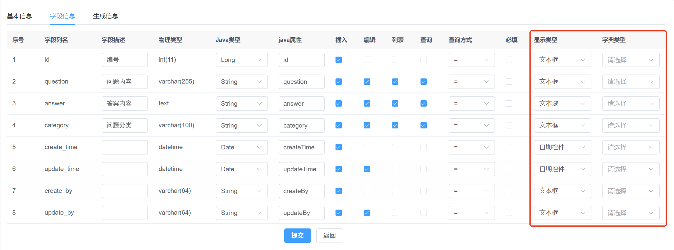 修改具体的模块内容,比如哪个字段是下拉菜单,哪个字段是查询条件等: