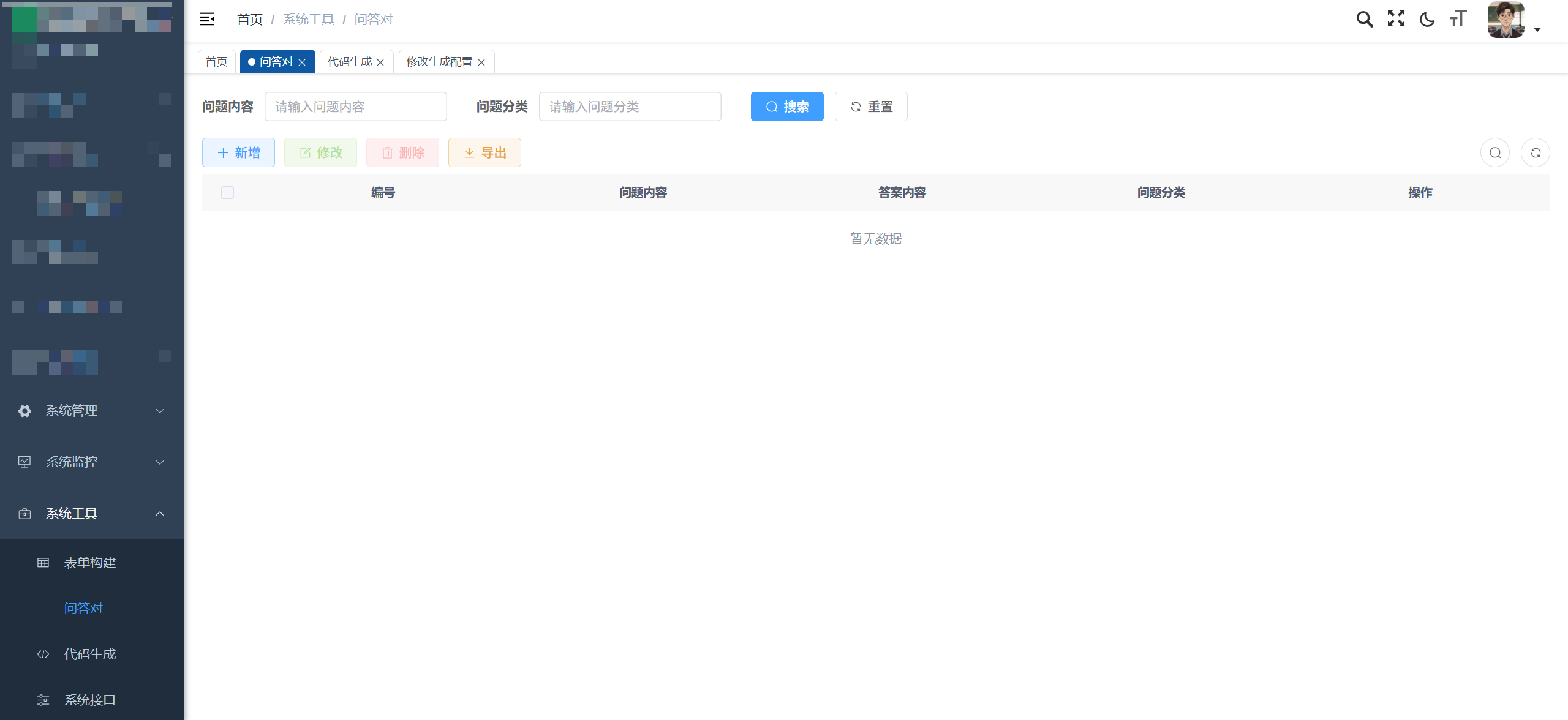 重新启动 后台java 和前端vue 。就会在 系统工具 菜单 中的 看到新增加的 问答对 模块