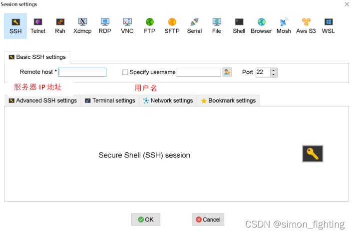 3、输入服务器IP地址和用户名(Ubuntu下查找或新建用户)