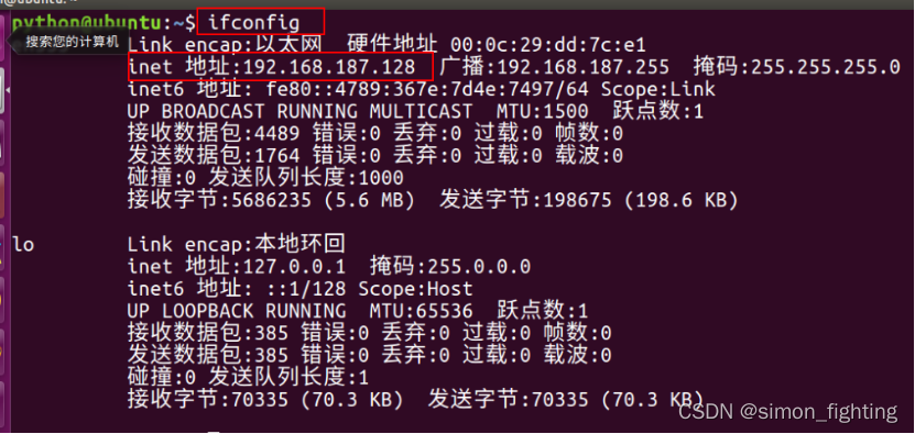 服务器IP地址:在Ubuntu系统下输入ifconfig