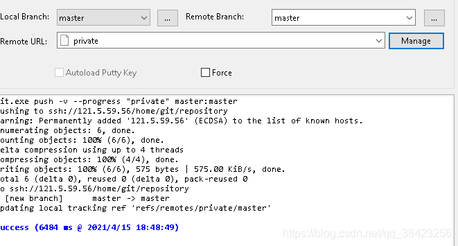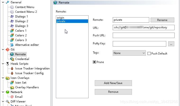 然后配置远程私有仓库连接地址ssh:/./git@服务器地址/home/git/仓库名称
