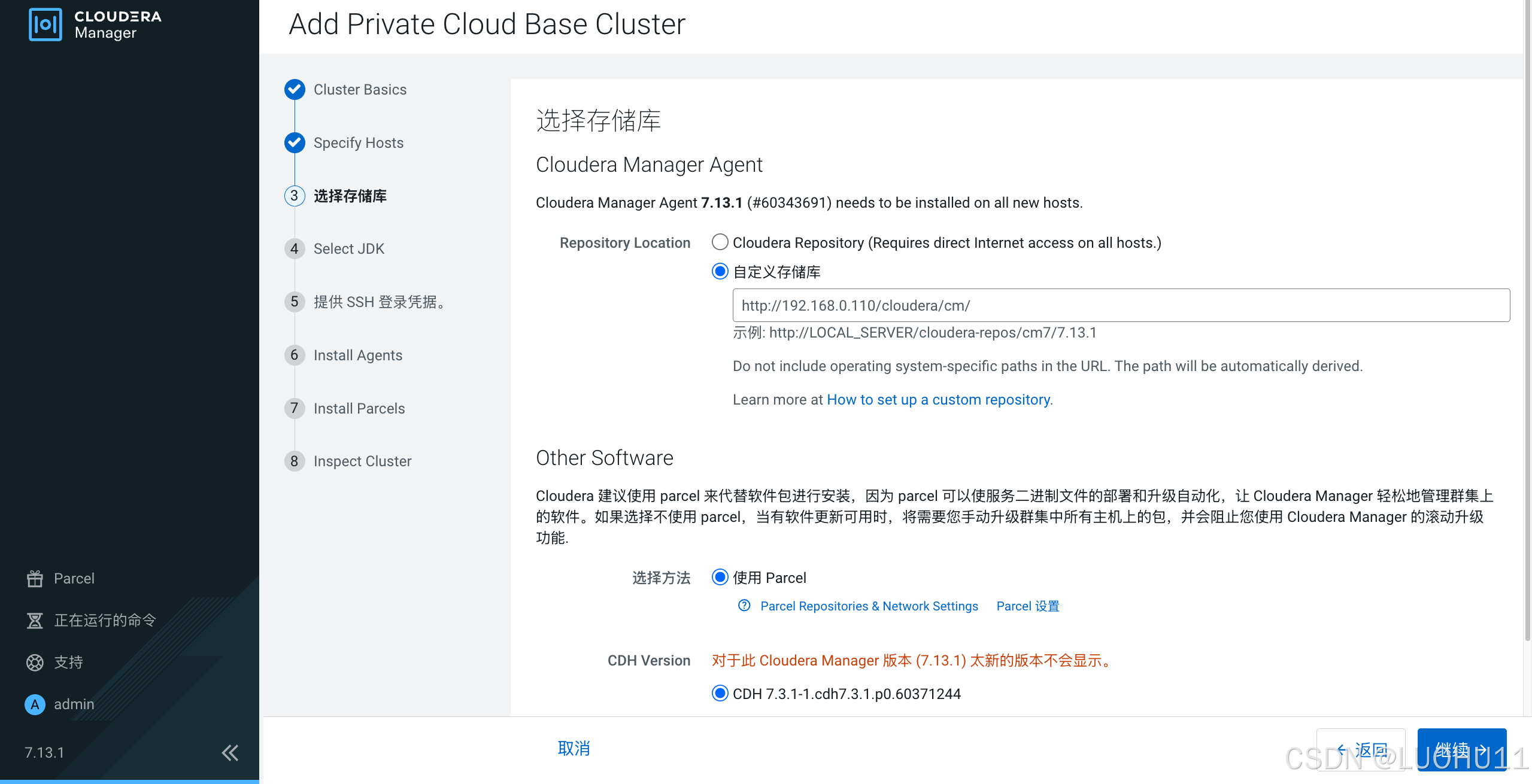 Cloudera Manager Agent勾选自定义存储库,填入http://192.168.0.171/cloudera/cm/