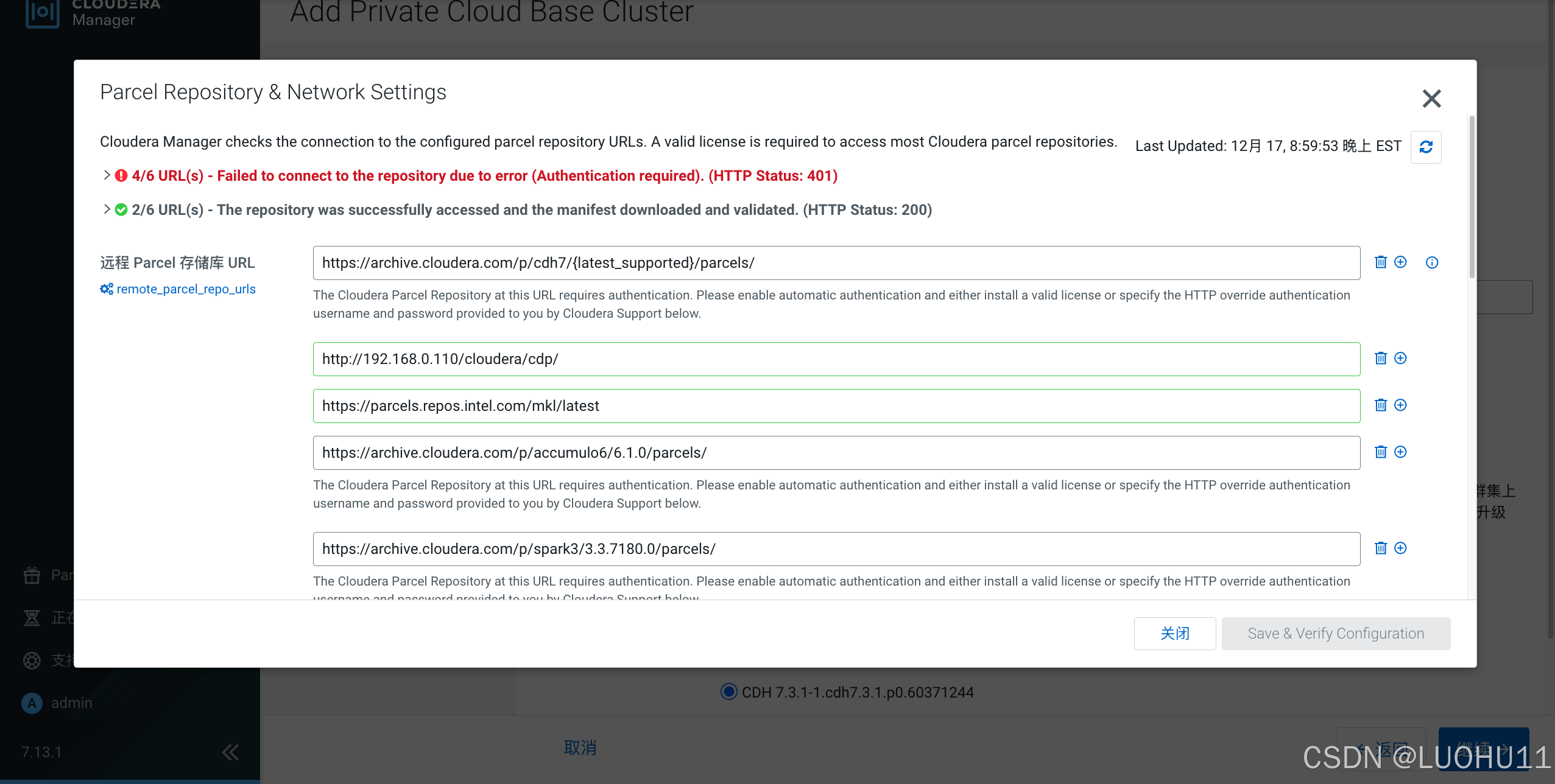 Other Software 勾选使用 Parcel,在Parcel Repository & Network Settings中填入http://192.168.0.171/cloudera/cdp/