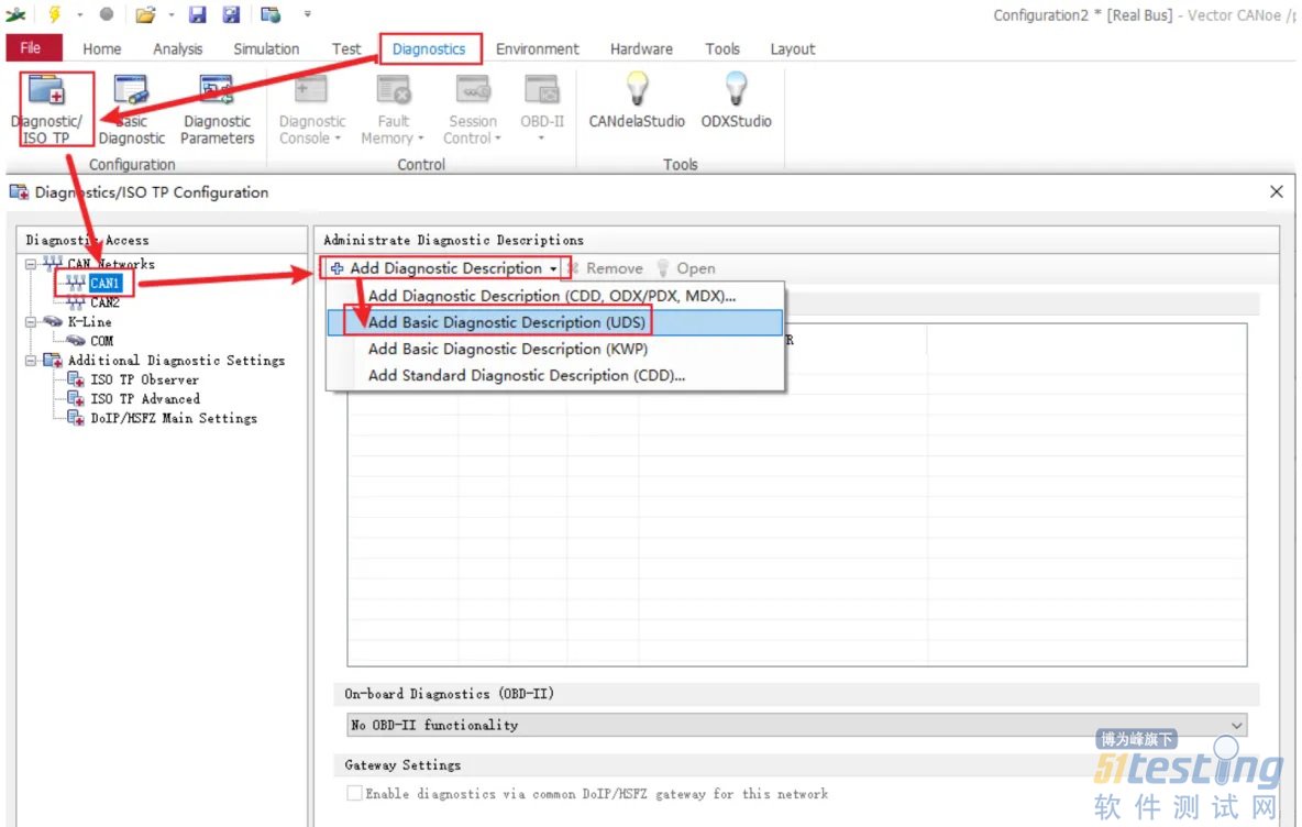 2、在诊断窗口添加BasicDiagnosticDescription(UDS)选项,使用CANoe工具内嵌的UDS入口,具体操作如下图:
