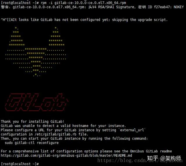 进入到gitlab-ce-10.0.0-ce.0.el7.x86_64.rpm文件所在的文件夹,执行命令rpm -i gitlab-ce-10.0.0-ce.0.el7.x86_64.rpm,大约需要2分钟,如果出现下图图像,证明安装成功。