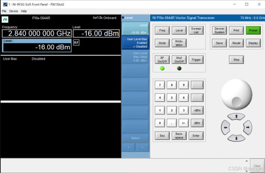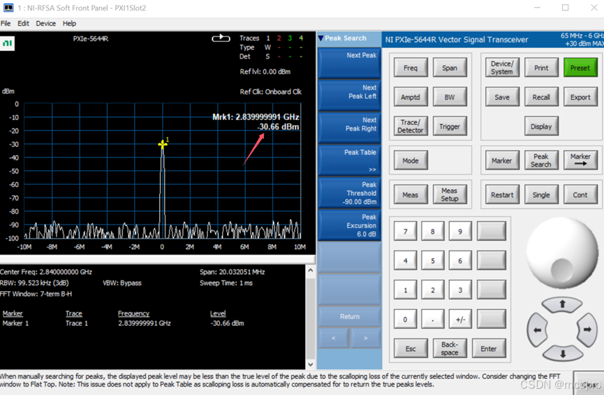 在上图中可以看到信号发生器产生的一个2.840G,-16db的型号,但是经过功分器以及传输线的衰减,实际上信号强度是有衰减的,可以将功分器的输出端连接连接到频谱仪上,测量实际功率。