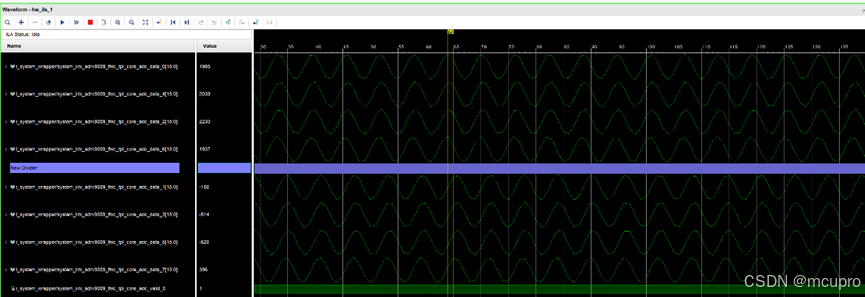 将BOOT.BIN文件复制到SD卡根目录下,插入MPSOC底板,启动模式设置为SD卡启动,插入JTAG,串口和电源线。关于每一路通道的内容可以看下图,其中0 到3通道为一片9009,4到7为另一片,其中奇偶数通道分为实部和虚部,由此可以得出,只需要重点看0和4通道就可以判断出两片9009是否同步。打开vivado的硬件管理器,打开ILA调试窗口,调试文件使用我们提供的ltx文件,全选通道右键设置