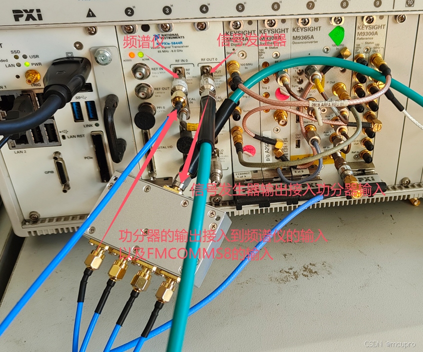 使用信号发生器产生一个2.805G的信号,使用功分器将信号源分成四路,分别插到fmcomms8 的四个RX口。