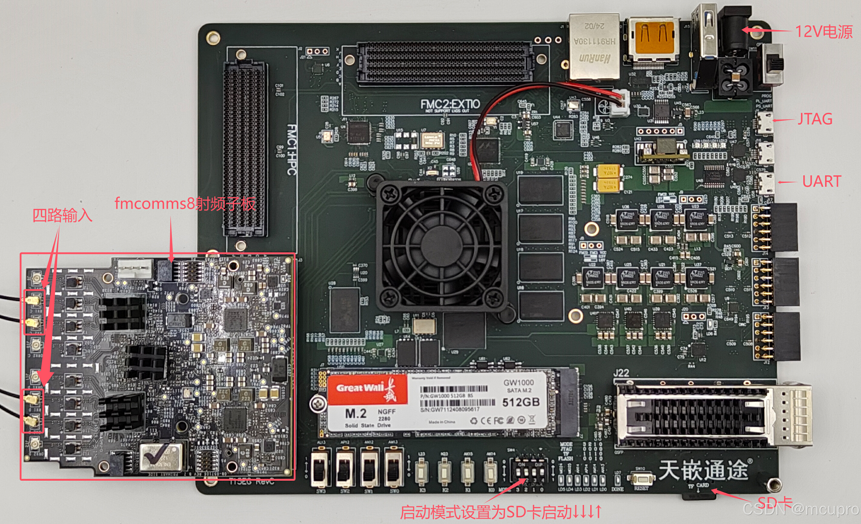 准备好我们提供的BOOT.BIN文件,以及ltx文件。将BOOT.BIN文件复制到SD卡根目录下,插入MPSOC底板,启动模式设置为SD卡启动,插入JTAG,串口和电源线。插入fmcomms8射频子板。