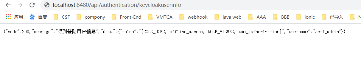 我们在之前配置了keycloak.security-constraints,所以需要有ROLE_VIEWER权限才能访问url /api/keycloaktest/*。如果我们以cctf_admin的用户登录,那么我们将能够访问下面的API。