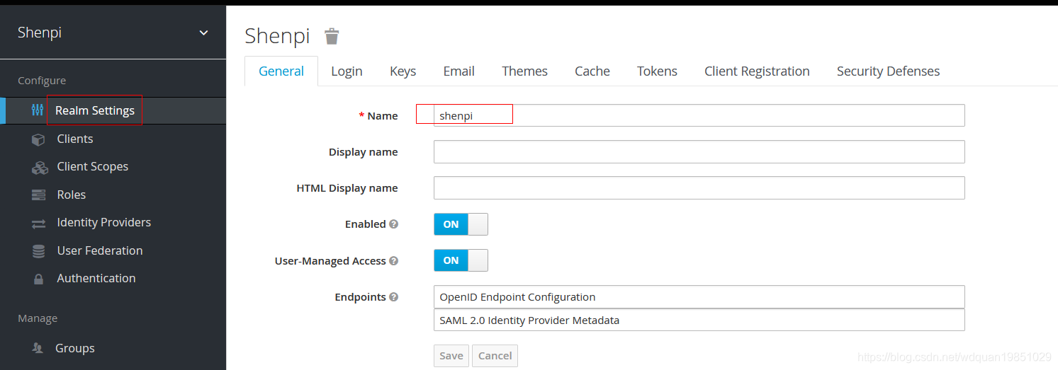 单击Create按钮后,将创建一个新的realm,我们将被重定向到这个realm。下面所有操作都将在这个新的shenpi realm中执行。