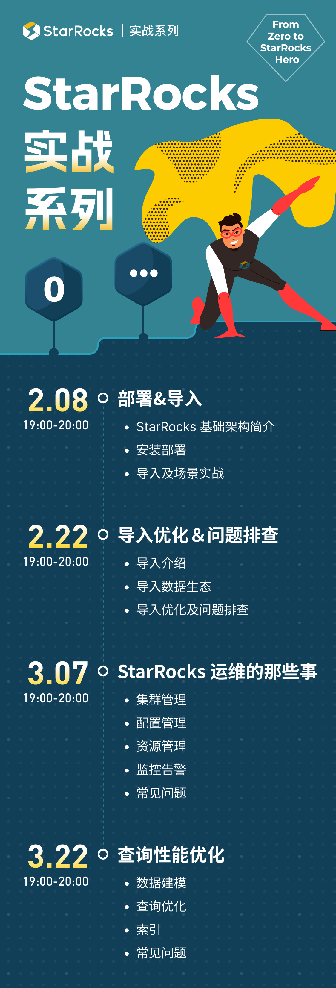 2023 年开春, StarRocks 社区重磅推出入门级实战系列直播,手把手带你 从 Zero to Hero 成为一个 “StarRocks Pro”!通过实际操作和应用场景的结合,我们将帮你系统性地学习 StarRocks 这个当今最热门的开源 OLAP 数据库。