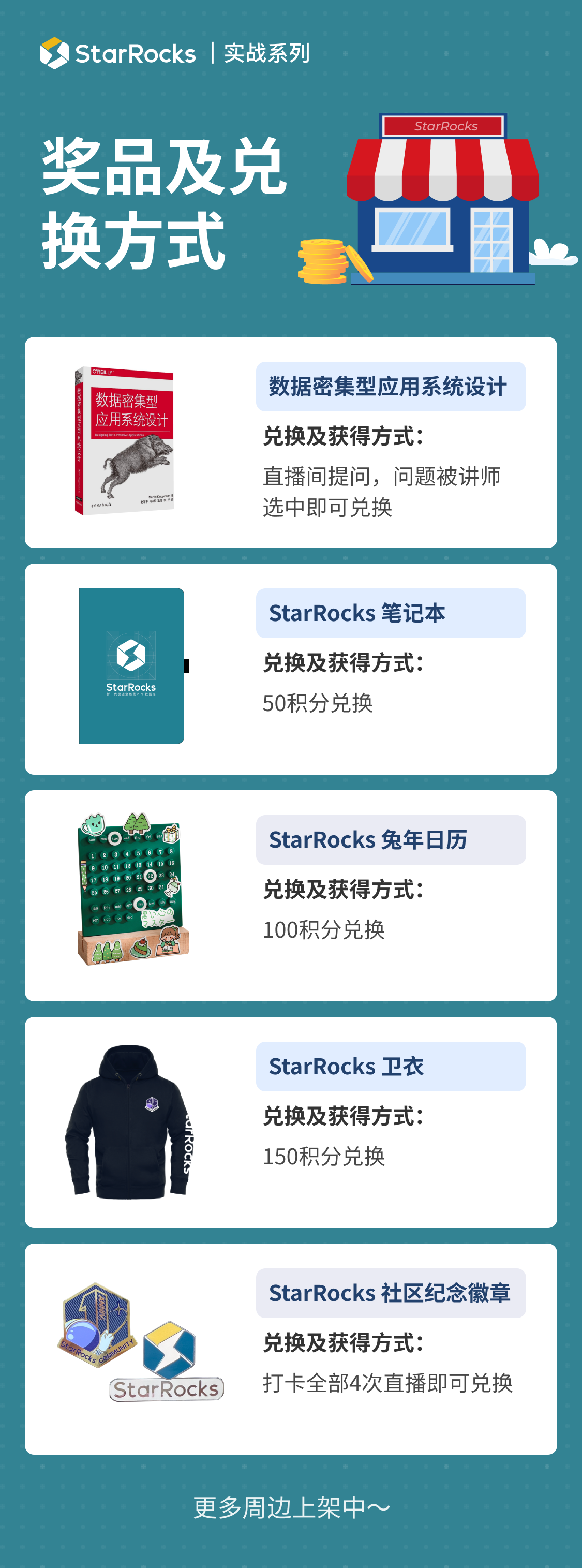 本次,我们针对 部署、导入、性能优化、运维等方向,以直播的形式进行讲解,本系列直播共分为4期,欢迎大家持续关注。另外,为了提高大家学习的热情,StarRocks 社区也增加了学习打卡的奖励机制:一边学习还能一边攒积分,积分可用于兑换 StarRocks 精美周边。另外, 成功打卡全部直播的小伙伴,还会收到额外奖励哦!