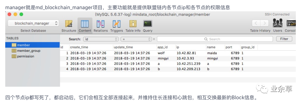 在 md_blockchian 项目启动时,在 ClientStarter 类中可见,启动时会从 manager 项目拉取所有节点的数据,并进行连接。如果自己的 ip 和 appId 等不在 manager 数据库中,则无法启动。