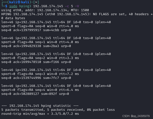 hping3 192.168.174.132 -c 5 -p 443 -A