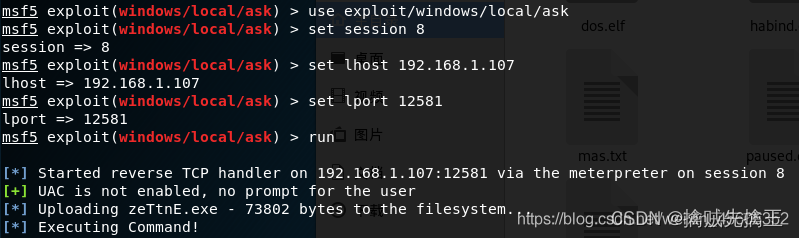 提高程序运行级别(runas)使用以下模块:exploit/windows/local/ask,该模块实际是使用更高权限运行程序,没有绕过UAC靶机会有响应,一般不使用。