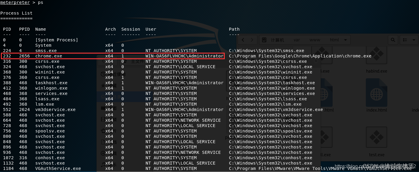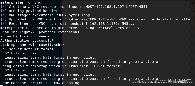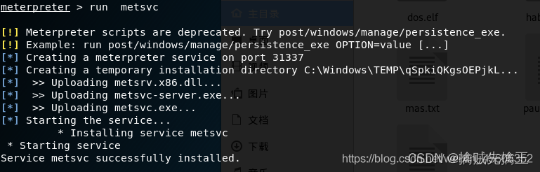执行过程:在目标主机上创建一个监听31337端口的服务->在目标主机c:\windows\temp\下创建一个存放后门服务有关文件程序的目录,并上传metsrv.x86.dll、metsvc-server.exe、metsvc.exe三个文件到该目录下->开启服务
