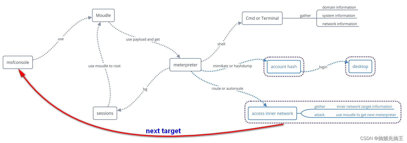 Meterpreter 还可以简化任务创建多个会话。可以来利用这些会话进行渗透。在 Metasploit Framework 中,Meterpreter 是一种后渗透工具,它属于一种在运行过程中可通过网络进行功能扩展的动态可扩展型 Payload。这种工具是基于 "内存DLL注入" 理念实现的,它能够通过创建一个新进程并调用注入的 DLL 来让目标系统运行注入的 DLL 文件。其中,攻击者与目标设备中Meterpreter 的通信是通过 Stager 套接字实现的 meterpreter 作为后渗透模块有多种类型,并且命令由核心命令和扩展库命令组成,极大的丰富了攻击方式。