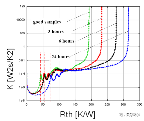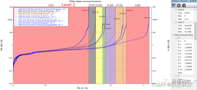 一次测试,既可以得到稳态的结温热阻数据,也可以得到封装结构内的全热流路径结构的热特性,T3Ster独有的Structure Function(结构函数)分析法,能够分析器件热传导路径上每层结构的热学性能(热阻和热容参数),构建器件等效热学模型,是器件封装工艺、可靠性试验、材料热特性以及接触热阻的强大支持工具,因此被誉为热测试中的“X射线”