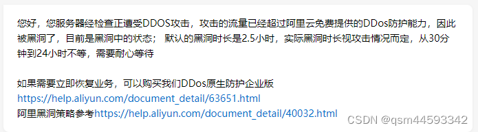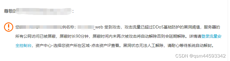 一天,收到阿里云发来的报警邮件,说明服务器已经受到DDOS攻击,超过基础防护黑洞阈值,这个时候,服务器的公网被断开,内网是可以用的。网站也不能打开。本次攻击时间短暂,未做处理,几分钟后,攻击暂停,网站恢复访问。