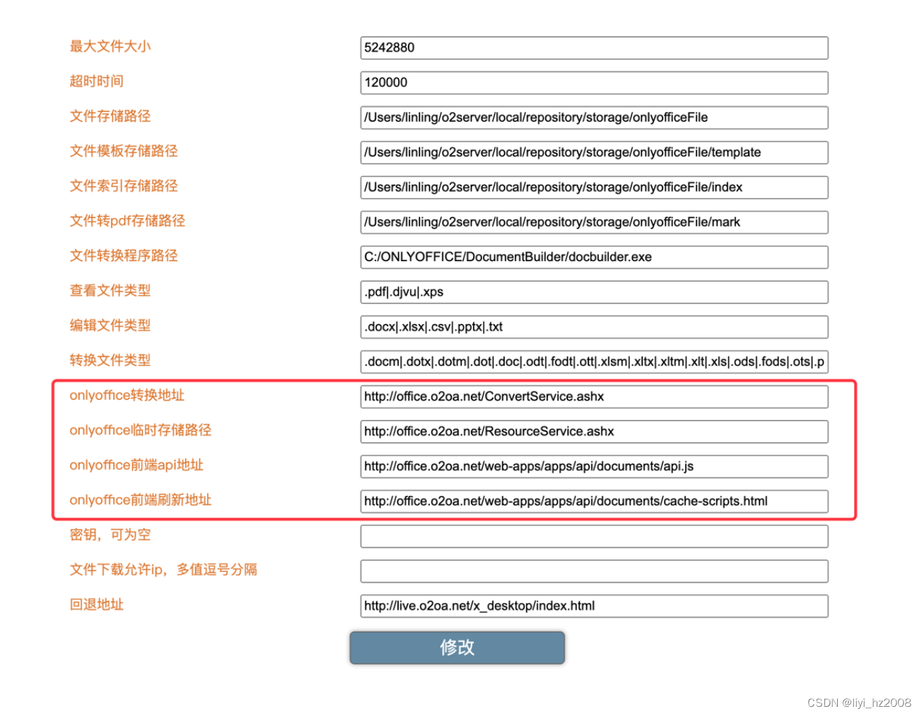 1、storageFolder:文档存储路径;如果为空,默认o2oa安装目录下的 local/repository/storage/onlyoffice;