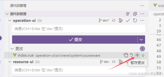修改完的文件会出现在“更改”中,点击“+”暂存更改