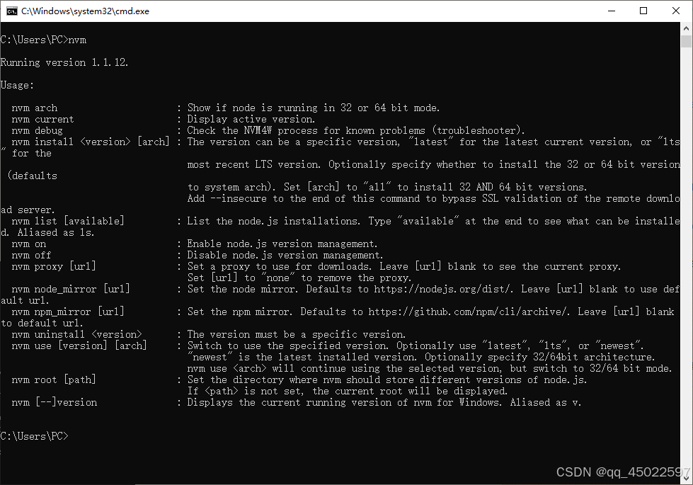 【win + R】,输入cmd,命令行输入nvm,出现以下即为安装成功