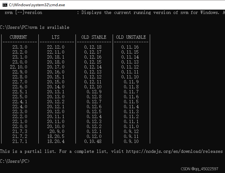 注意:安装nvm时不能安装任何node版本,如存在请删除后再安装nvm,保证系统无任何node.js 残留。卸载完之后cmd命令行输入 node -v 查看是否还能查到node信息。