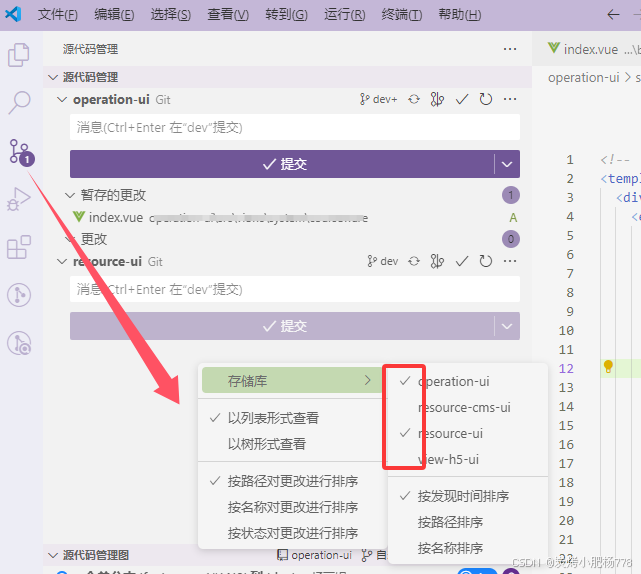 点击左侧图标打开源代码管理栏,在空白处鼠标右键,可以选择需要展示的存储库