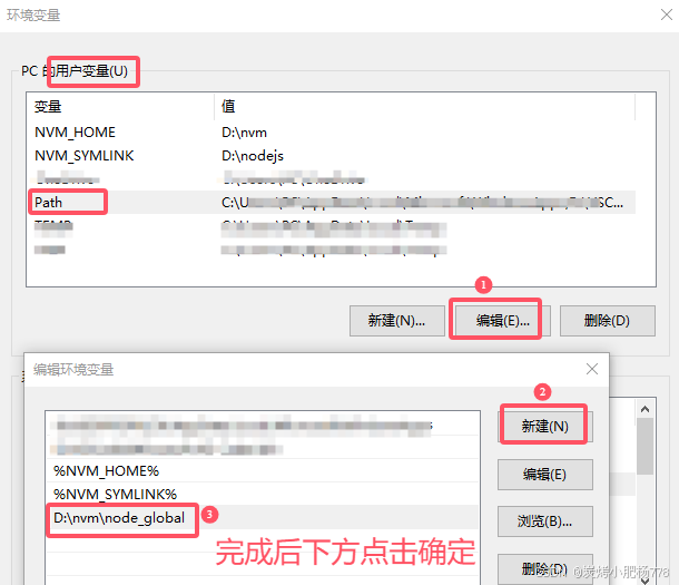 在用户变量 - 【编辑】Path -【新建】输入node_global路径,点击确定