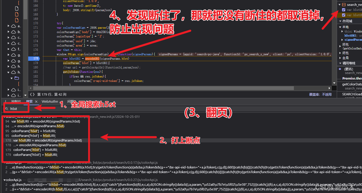 3、我们全局搜索h5st,然后打上断点,执行一下翻页,断住后,我们要把其他没有断住的给取消掉,防止冲突搞错