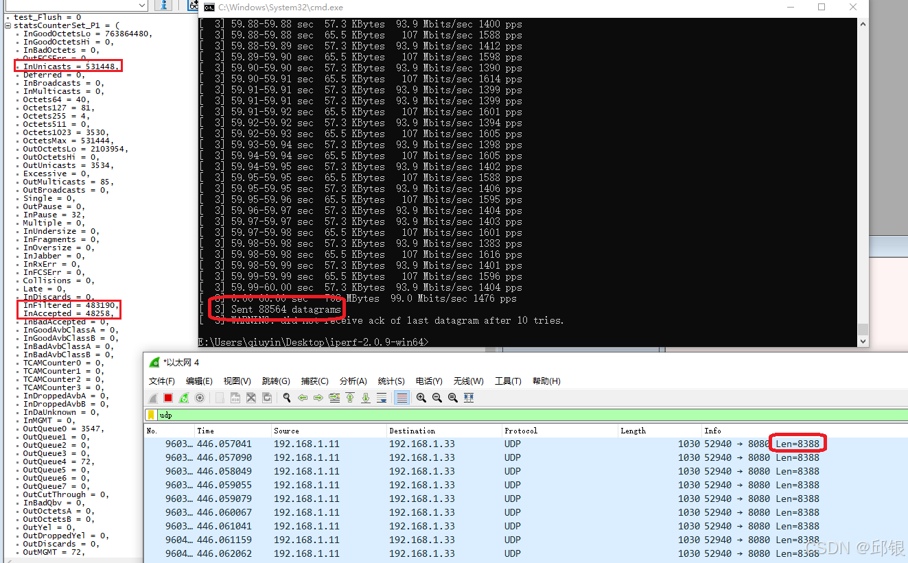- 通过iperf一共发了88564个datagrams,按照8388/1500 = 5.592 ≈6个frame,那么Switch理论上需要抓到88564*6 = 531384,跟normal Statistics Counter计数的InUnicasts几乎一致。