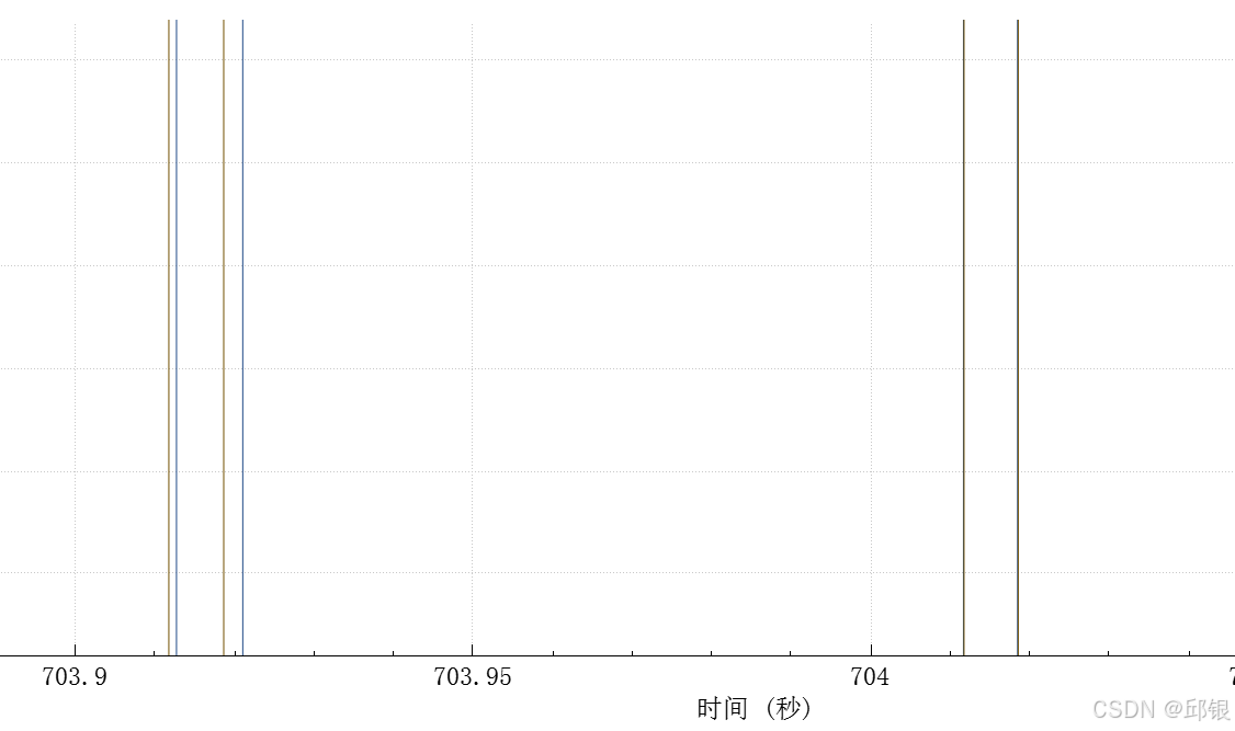 可以明显看出frame的间隔在100ms,且在703.9s处有4组报文(每一条竖轴代表一个Queue state下的frame,目前发送了2个vlanId的报文,),目前无法精确测量出Queue state的持续时间。