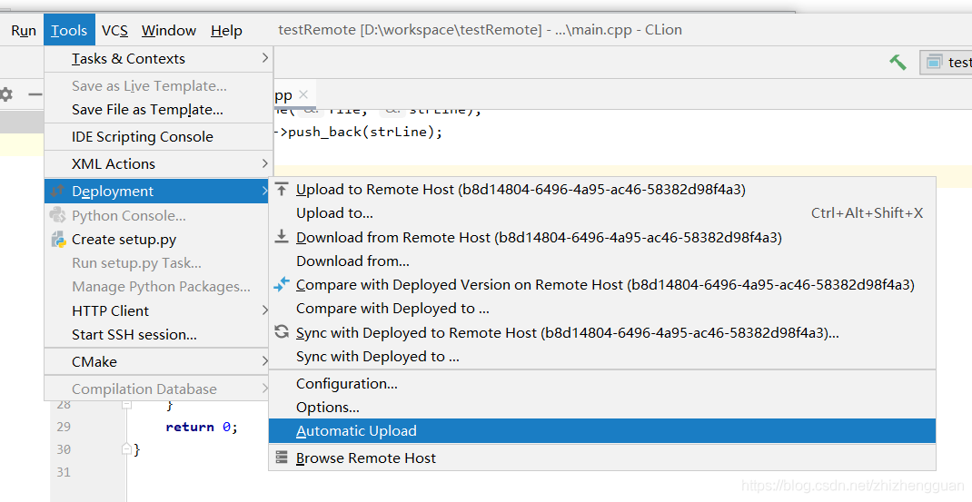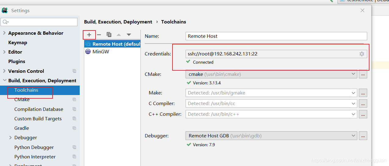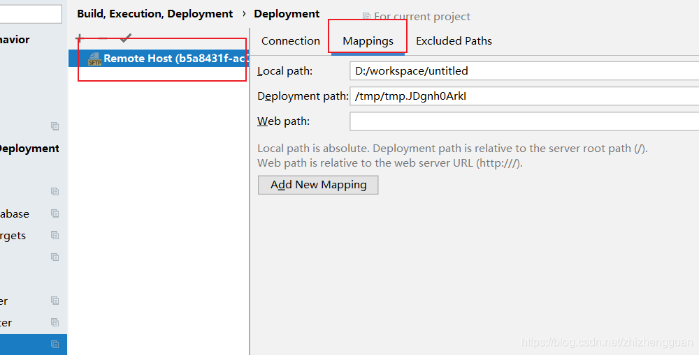7.我们在上面(第6和第3)可以看到Remote Host(远程主机),这个是根据第1步自动生成的。我们可以在File->Settings-> Build,Execution->Deployment.看到它