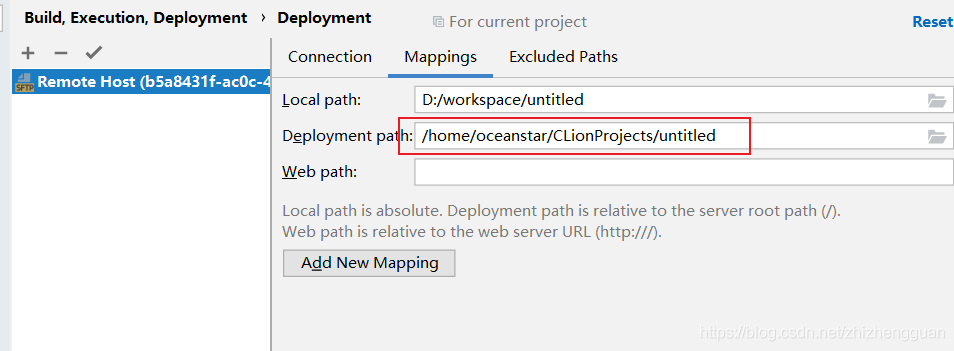 当然,我们也可以手动修改它(比如说重命名之类的,这里不修改,默认即可)。最重要的是我们可以在这里指定将代码同步到远程服务器的哪个目录下: