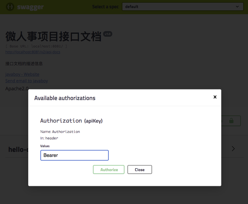 大家可以看到,页面中多了一个 Authorize 按钮,点击该按钮,输入 Bearer ${token}