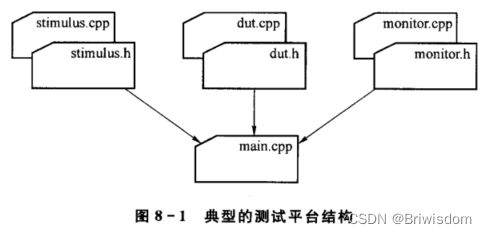 有三个主要模块,激励生成模块(stimulus.h, stimulus.cpp), 输出的检测和比较模块(monitor.h和monitor.cpp), 被测设计模块(dut.h和dut.cpp)。主程序main.cpp链接了这三个不同模块并将它们互相连接起来,构成一个测试平台。
