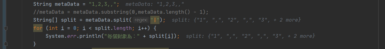 System.err.println("每個對象為:" + split[i]);