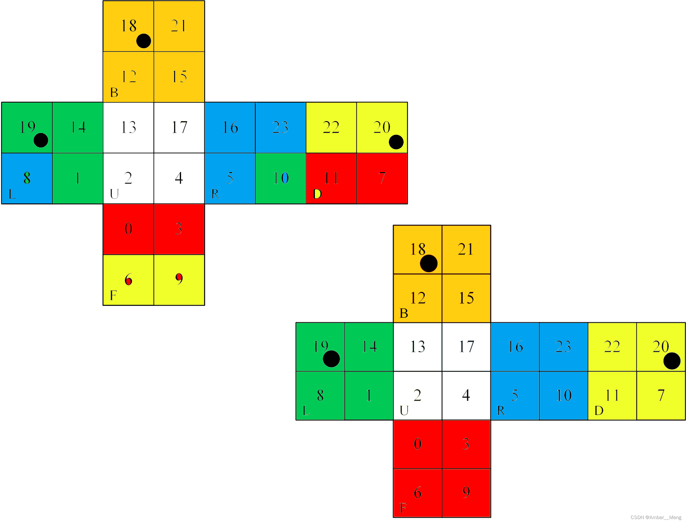 2、因为本算法不涉及对魔方整体空间位置旋转的操作,所以输入前必须调整魔方位置,保证两组状态中[18][19][20]三个面的颜色完全相同,如上图所示。
