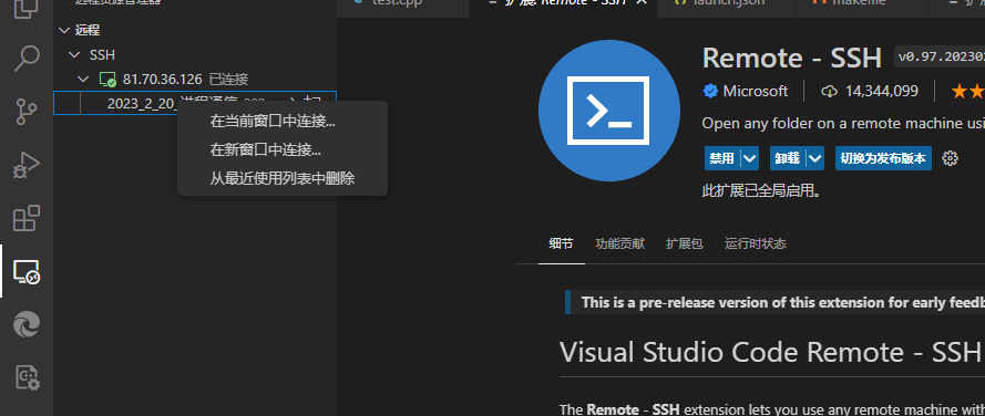 下载完Remote - SSH 后,左边会多出来一个电脑的图标,打开就会发现刚刚添加的服务器IP.(如果没有可能是没刷新,退出重进一下试试),右键我们的添加的服务器IP,出现的两个选项任选一个。在vscode中我们可以直接使用Linux终端的命令行进行代码的编译和运行(省略了我们大部分的配置时间)打开左上角的资源管理器,选择打开文件,我这里是已经打开了(会让你在输入一次密码)弹出以下的界面,输入我